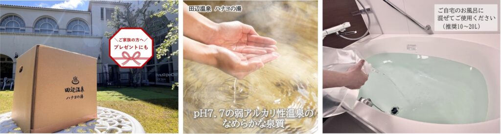 ご宿泊者様限定だったハナヨ温泉をこの度ご自宅でもお楽しみいただけるようになりました。ぜひご自宅で、とろ〜り美肌の湯を体感してください。ご家族や大切な方への贈り物にもぴったりです。